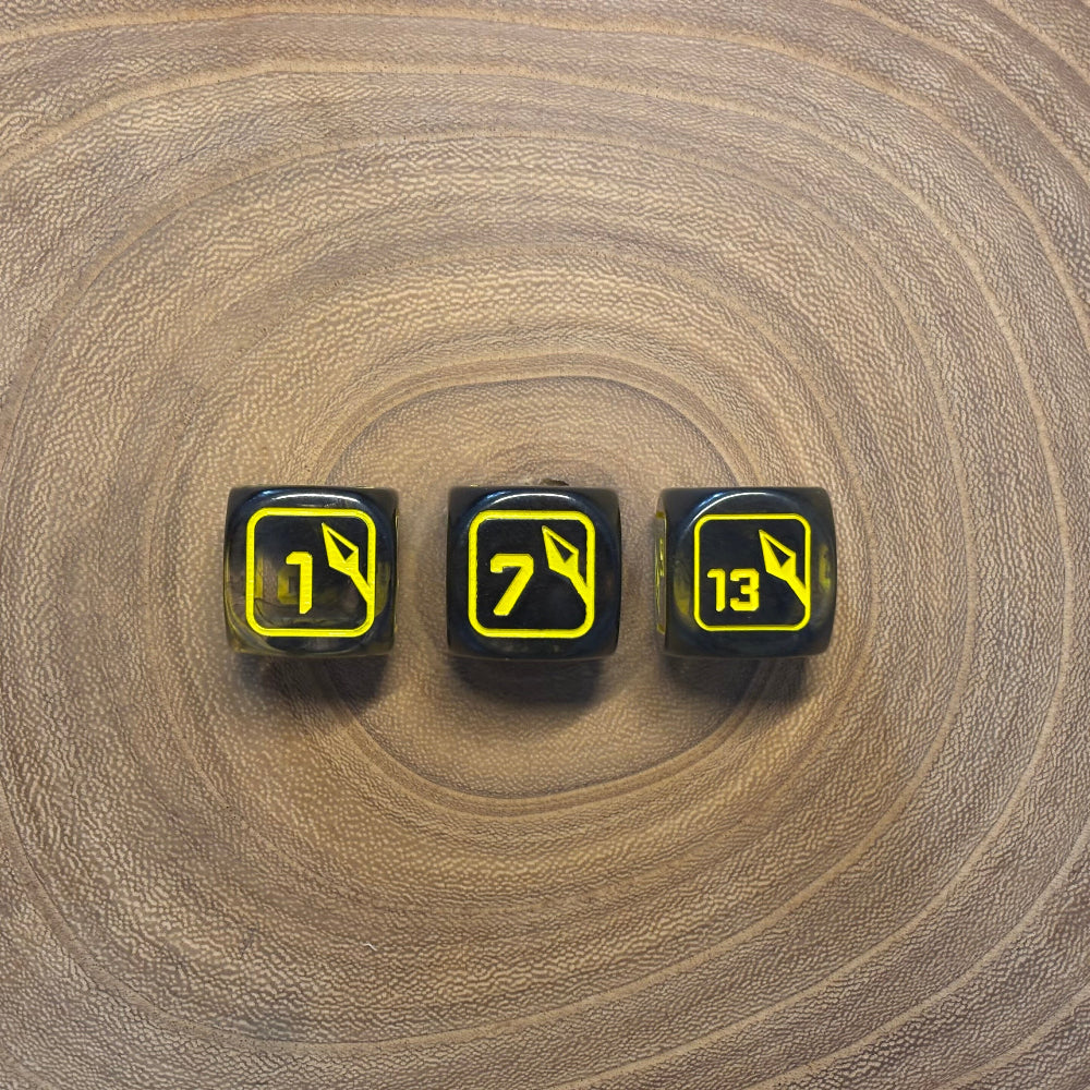 Du erhältst 1x Würfel mit 1 - 6 Attack Damage, 1x Würfel mit 7 - 12 Attack Damage und 1x 13 - 18 Attack Damage Würfel. Der Würfel ist 22 mm breit und Semi-Transparent. Mit diesem Set bist du in der Lage deine Combat Chain nachvollziehbar darzustellen.