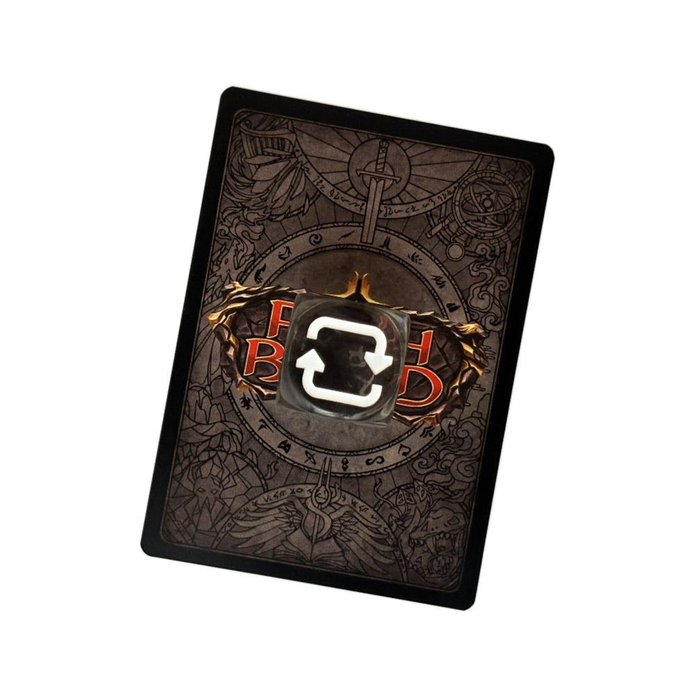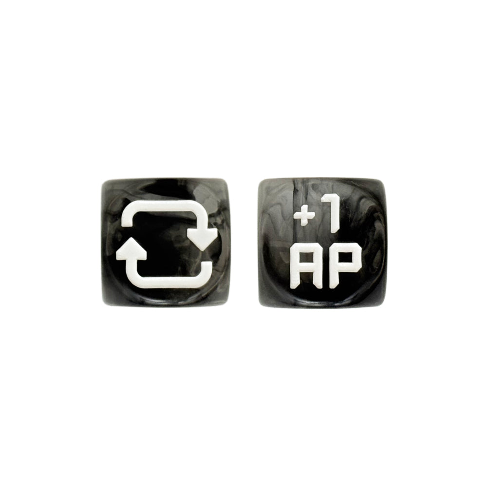 Du erhältst zwei Status Würfel mit den Symbolen Go Again, Dominate/Overpower, Aim, +1 Actions Point, -1 Shield und -2 Shield. Jeder Würfel ist 22 mm breit und Semi-Transparent.
